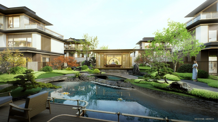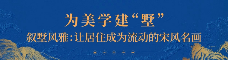 在建筑園林打造上,延續(xù)“山河”系列一脈相承的宋式美學(xué)基因,萃取《營造法式》中經(jīng)典建筑語匯,以“落客、登門、入境、入畫、人心”五進(jìn)禮序空間,層層遞進(jìn),演繹歸家儀式感。同時遵循宋代園林“堆山、疊石、理水”的造園古法,將建筑輪廓、錯落灌木、蜿蜒小橋與靈動流水相融,構(gòu)建高、中、低三重立體景深層次。日常動線仿若穿行于流動的宋風(fēng)長卷,意境悠遠(yuǎn),心歸畫中。