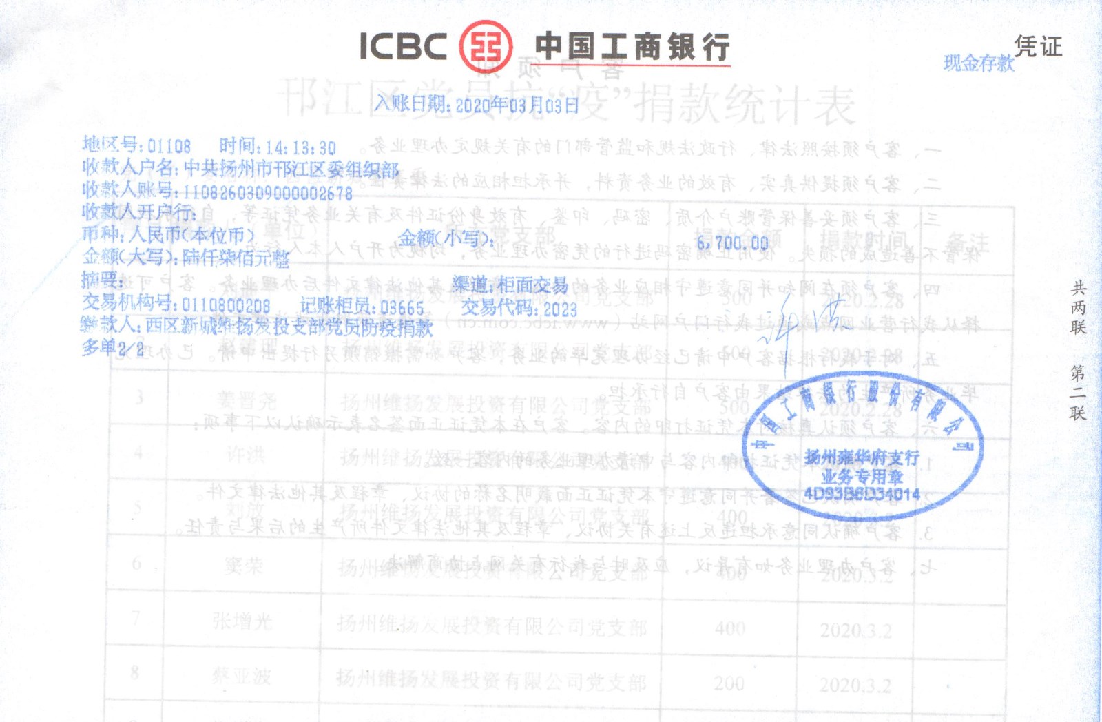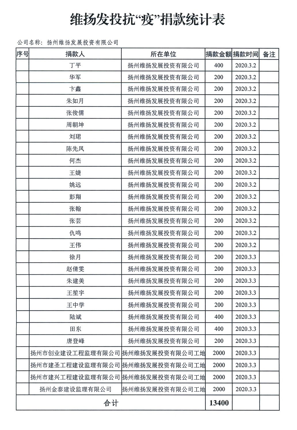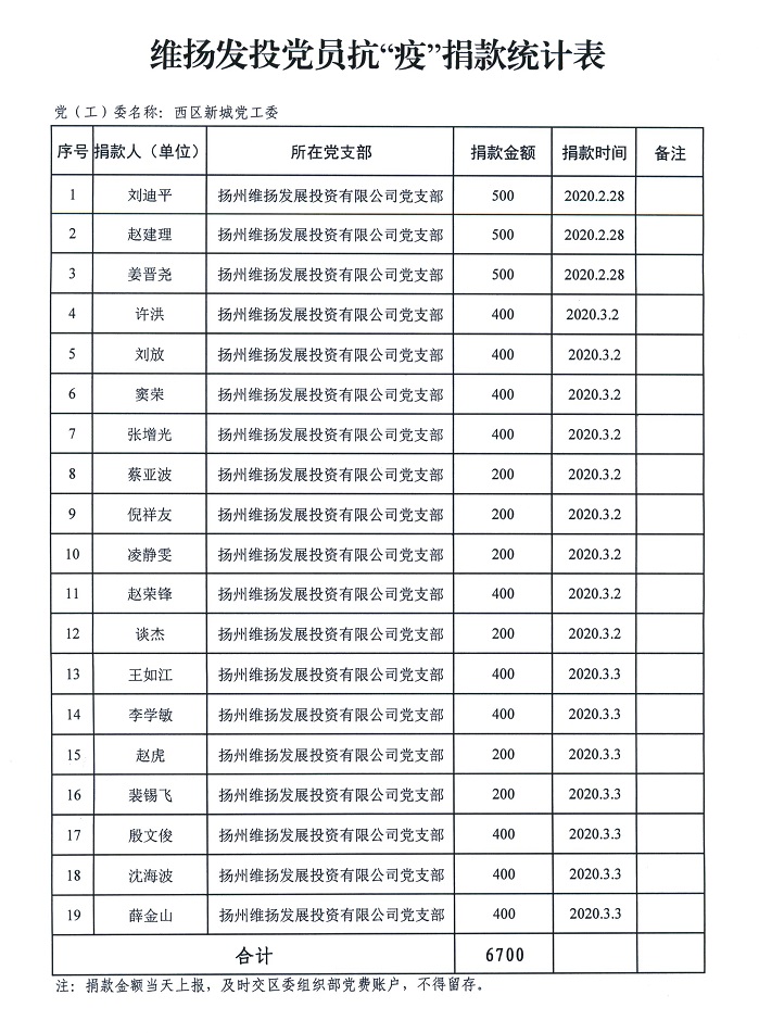 為積極響應區(qū)委、區(qū)政府號召,表達公司黨員職工對疫情防控工作的堅定支持。3月3日下午,由公司黨支部牽頭,組織黨員干部、普通職工以及相關合作單位開展自愿捐款活動,支持疫情防控。 公司黨支部書記、副董事長劉迪平首先發(fā)起捐款倡議,“黨有號召,我有行動”。班子成員緊隨其后,黨員職工及合作企業(yè)紛紛響應,踴躍捐款,用點滴愛心集聚起支援疫情防控的強大正能量。 涓流不吝,以成江河。截止目前,公司黨支部一共向邗江區(qū)委組織部賬戶匯入黨員抗疫特殊黨費6700元。公司員工及合作單位也籌集了13400元的抗疫愛心捐款,匯款至邗江區(qū)紅十字會。 疫情期間,我公司全體黨員干部職工,以實際行動為疫情防控盡一份心意,詮釋了共產(chǎn)黨員和國企人的初心本色。