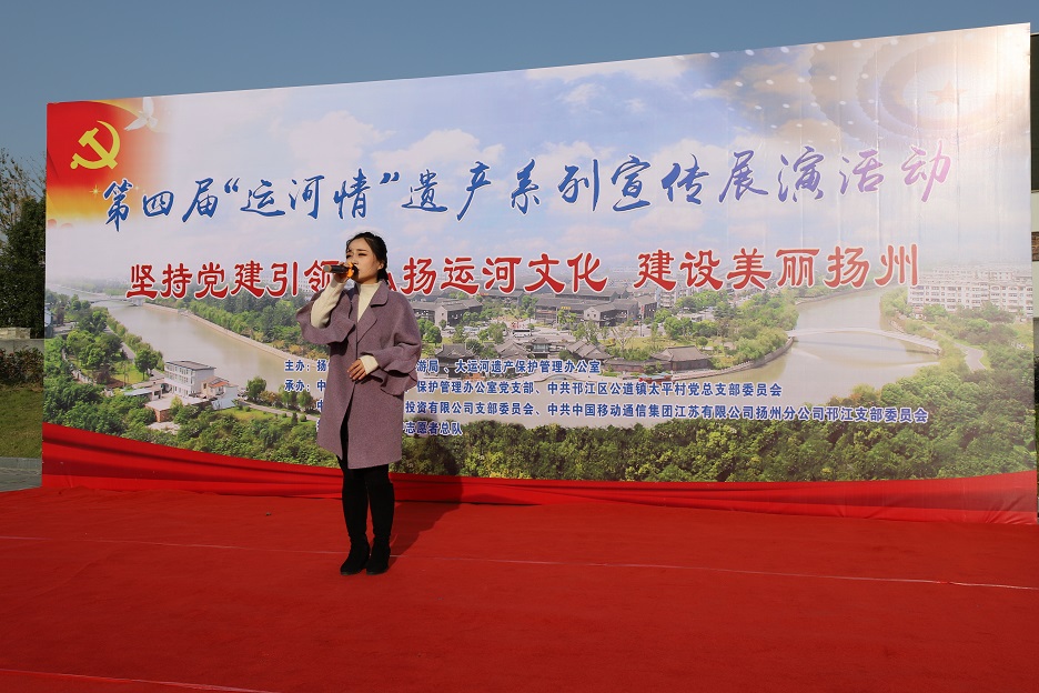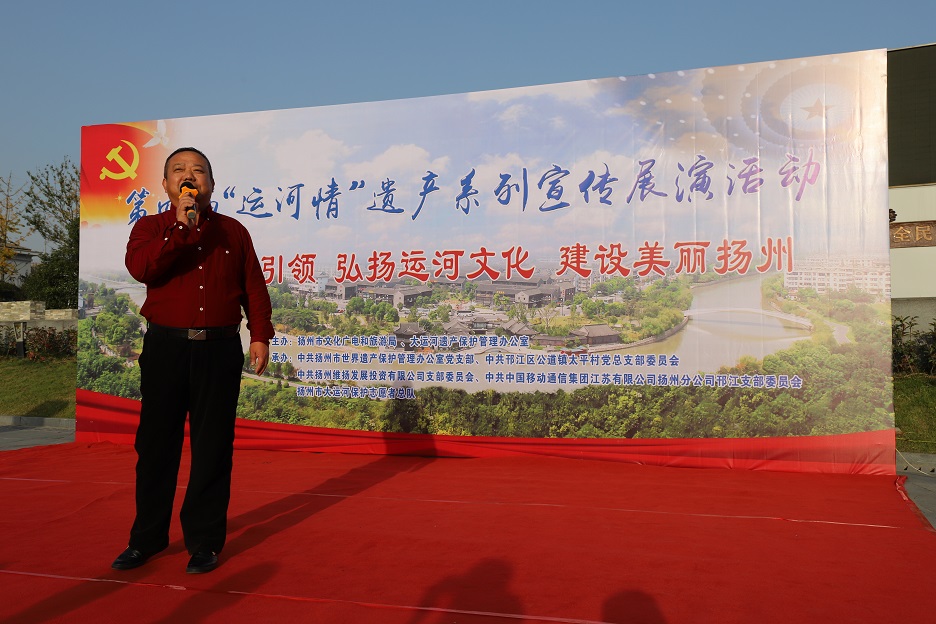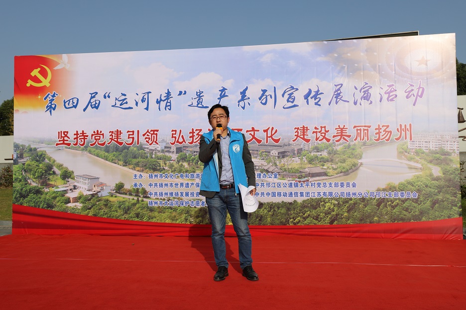 為充分發(fā)揮廣大市民在大運(yùn)河遺產(chǎn)保護(hù)、傳承和利用中的重要作用,深入挖掘大運(yùn)河的歷史、科學(xué)、文化價(jià)值,宣傳普及大運(yùn)河遺產(chǎn)知識,11月8日下午,在蜀岡體育公園舉辦了以“堅(jiān)持黨建引領(lǐng) 弘揚(yáng)運(yùn)河文化 建設(shè)美麗揚(yáng)州”為主題的第四屆“運(yùn)河情”遺產(chǎn)宣傳展演系列活動。 本次活動由揚(yáng)州市文化廣電和旅游局、大運(yùn)河遺產(chǎn)保護(hù)管理辦公室主辦,由中共揚(yáng)州市世界遺產(chǎn)保護(hù)管理辦公室支部委員會、中共揚(yáng)州市邗江區(qū)公道鎮(zhèn)太平村總支部委員會、中共揚(yáng)州維揚(yáng)發(fā)展投資有限公司支部委員會、中共中國移動通信集團(tuán)江蘇有限公司揚(yáng)州分公司邗江支部委員會、揚(yáng)州市大運(yùn)河保護(hù)志愿者總隊(duì)聯(lián)合承辦。 活動共有四個(gè)環(huán)節(jié):首先,由專業(yè)人士解讀大運(yùn)河文化帶建設(shè)相關(guān)政策和規(guī)劃。